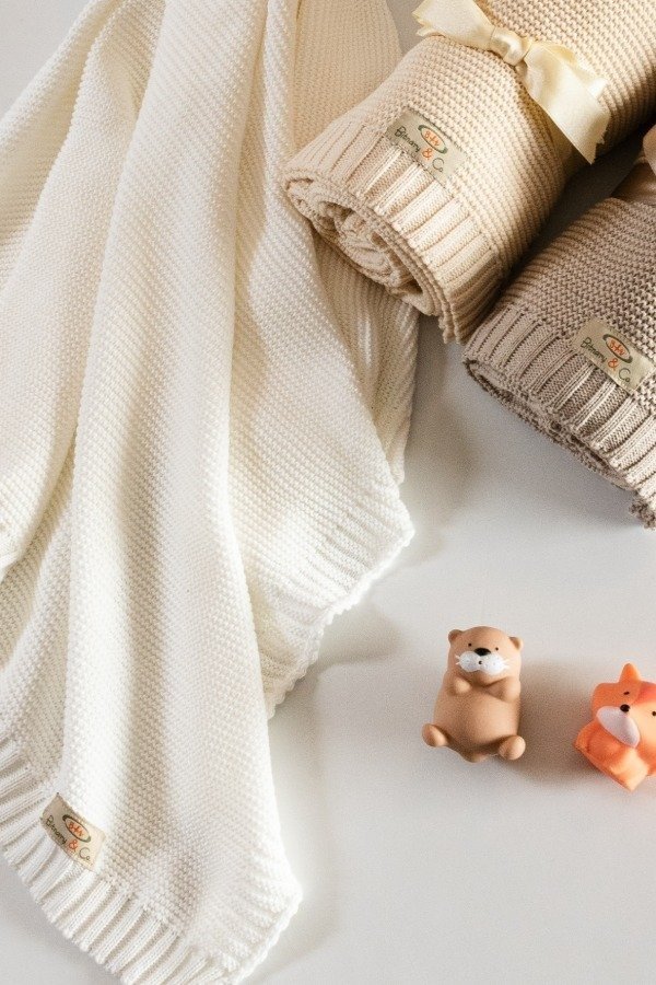 Manta tejida para bebé, suave. Ideal para cuna, cochecito o regalo. Disponible en varios colores, con delicados patrones de tejido y presentada con un lazo satinado.