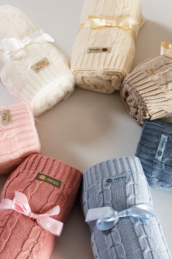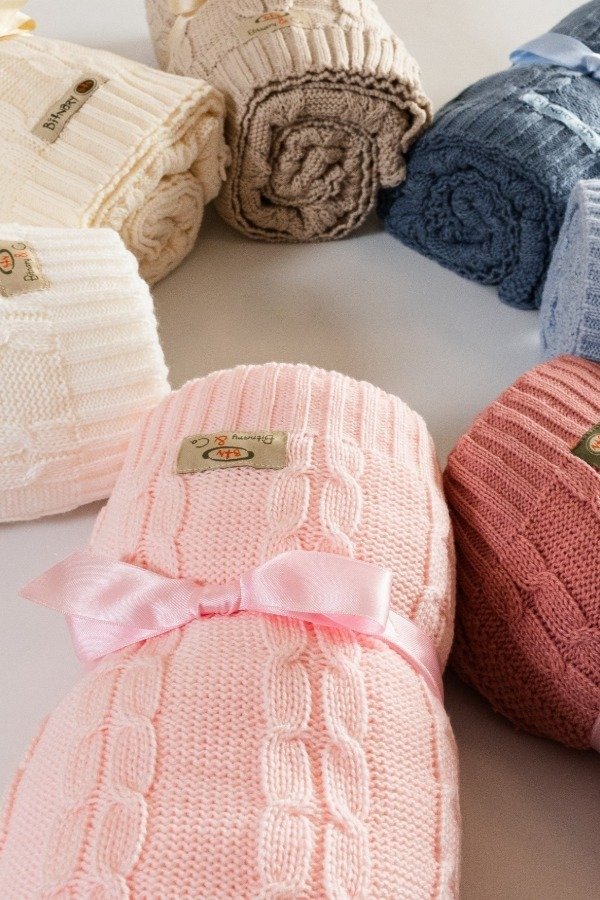 Manta tejida para bebé, suave. Ideal para cuna, cochecito o regalo. Disponible en varios colores, con delicados patrones de tejido y presentada con un lazo satinado.